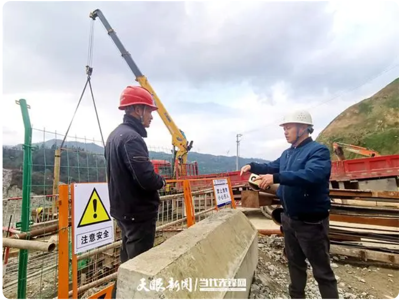 鳳山水庫工程建設(shè)管理部工程管理室主任簡杰(右)和工程人員進(jìn)行施工交流。